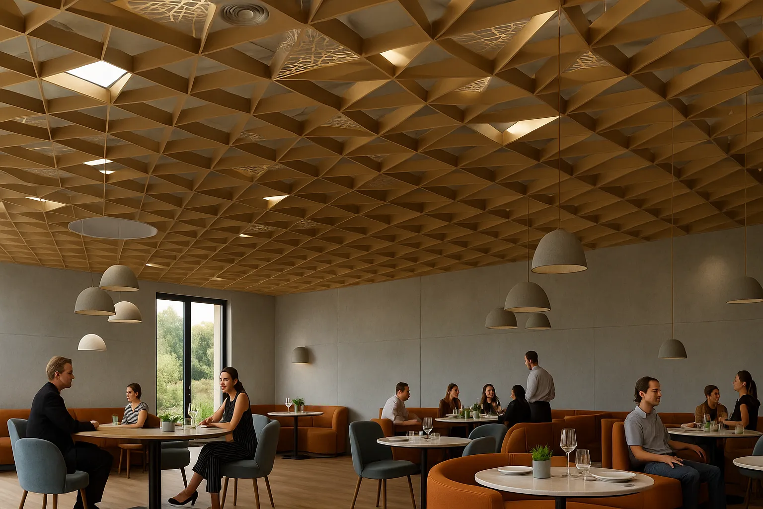 Интерьер современного кафе формирует впечатление о заведении не меньше, чем меню, освещение или мебель. Пространство должно работать на атмосферу, комфорт гостей и узнаваемость бренда. Именно поэтому потолок сегодня рассматривается не как техническая поверхность, а как важная часть интерьерной концепции.