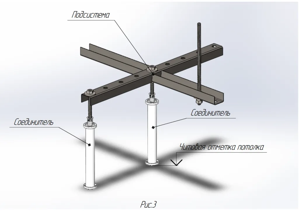 После установки всех элементов формируется завершённый узел крепления, обеспечивающий стабильную геометрию потолка и возможность дальнейшего обслуживания инженерных систем.