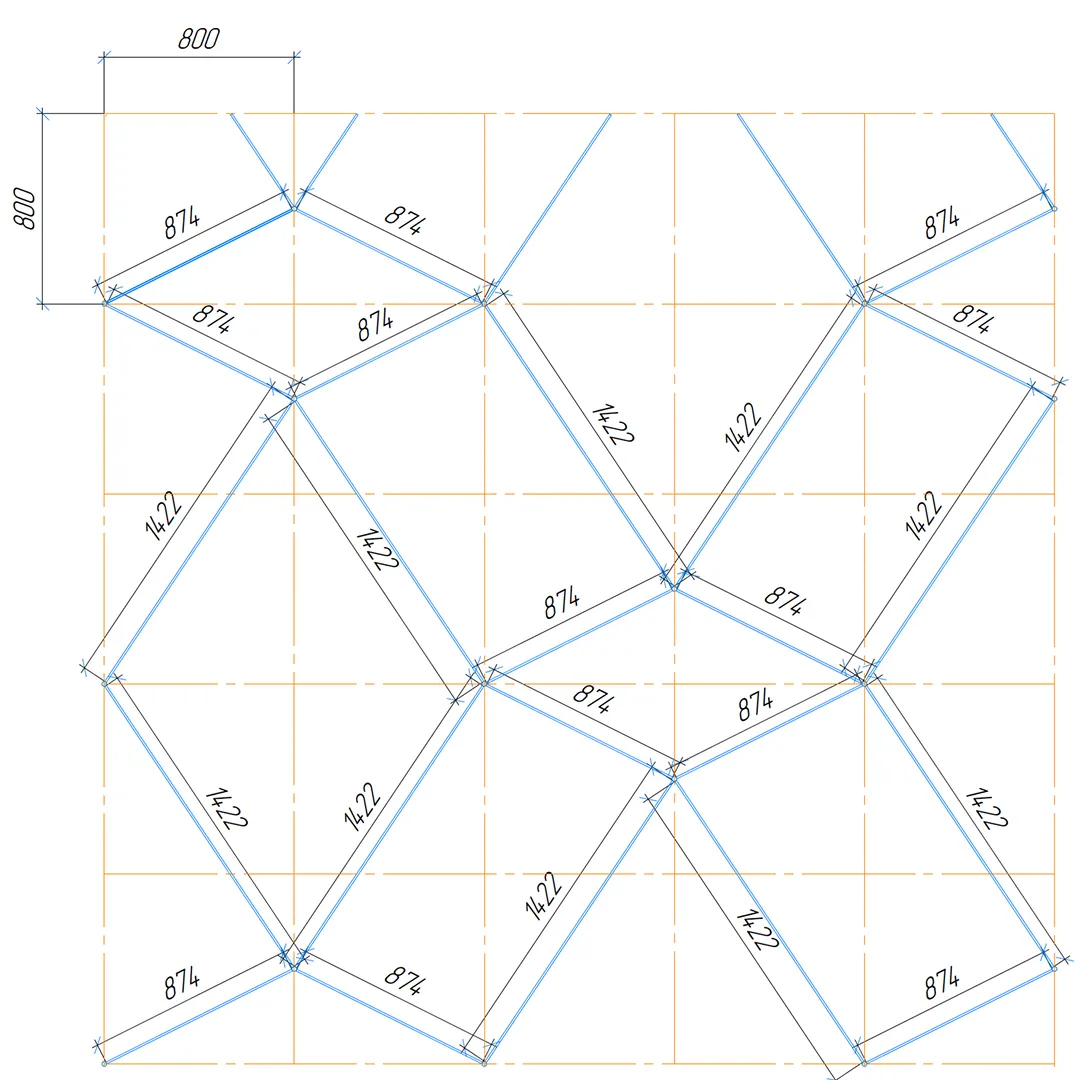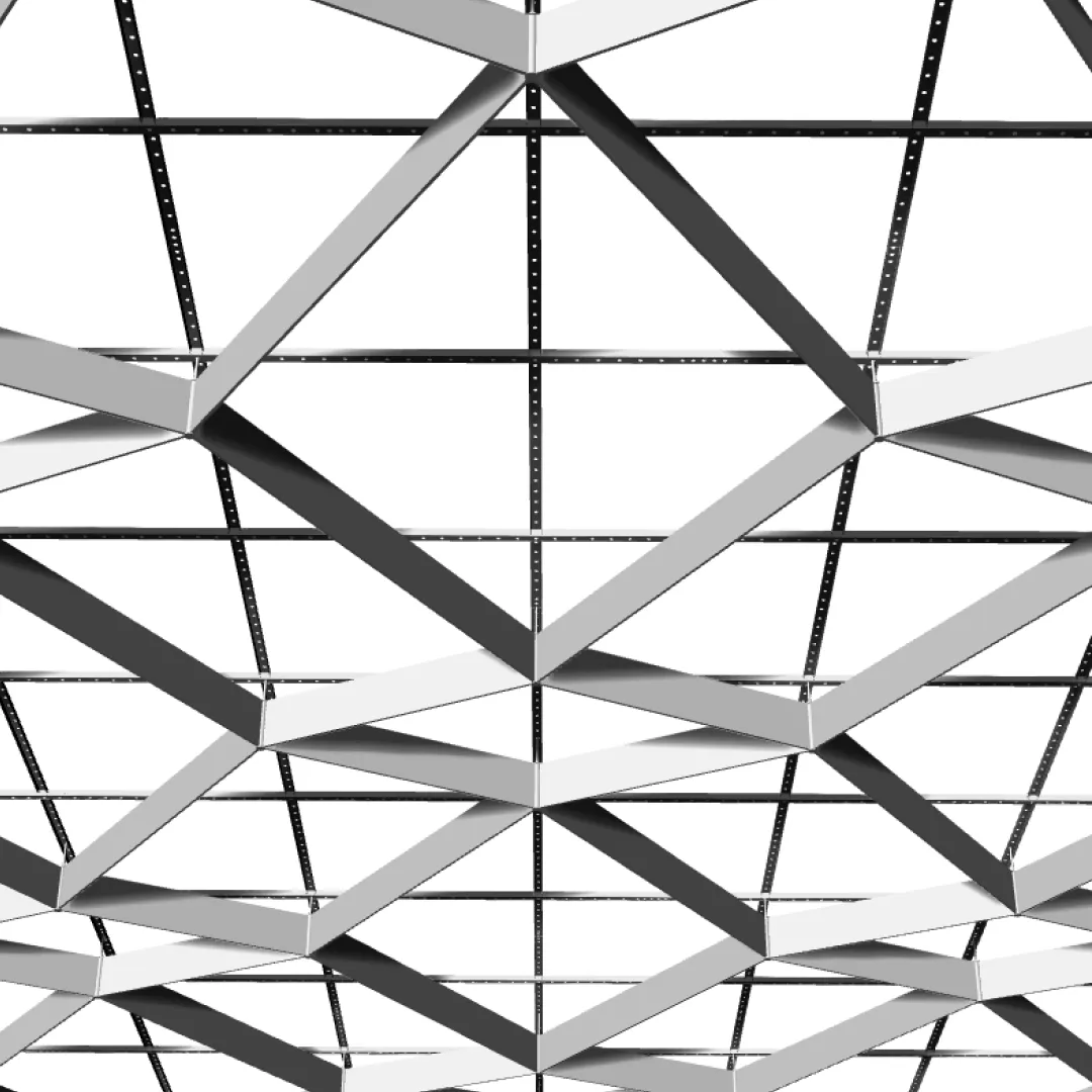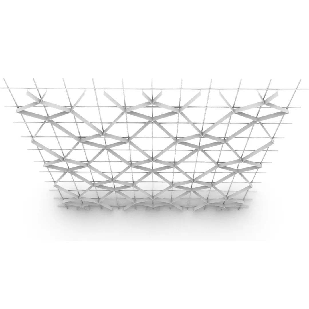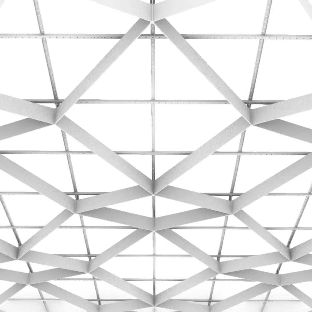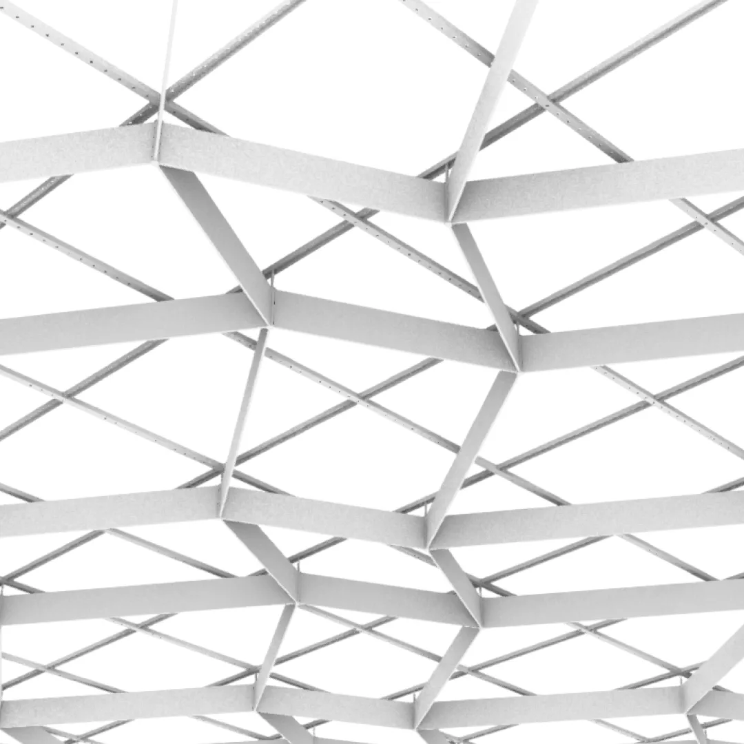 Конструкция формирует повторяющийся рисунок с равномерным расположением ромбических модулей, благодаря чему потолочная поверхность сохраняет визуальный порядок и чёткий архитектурный ритм.