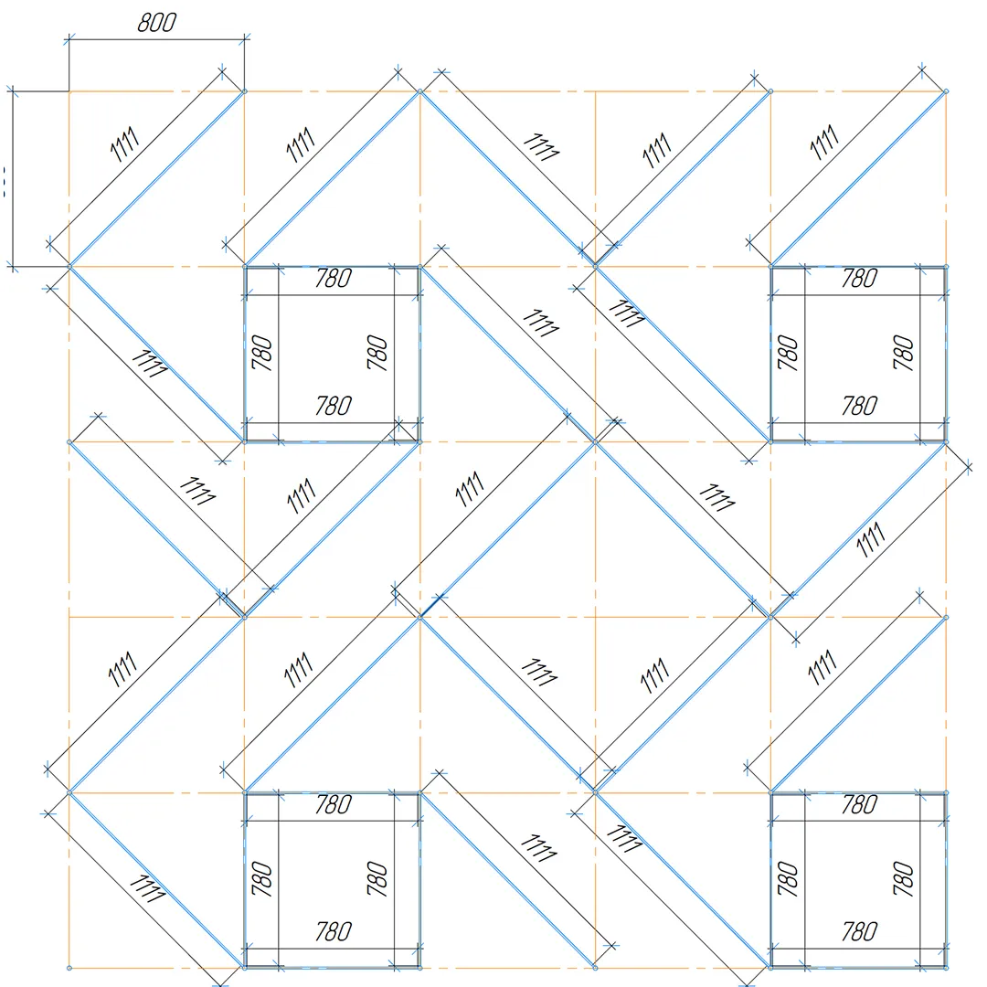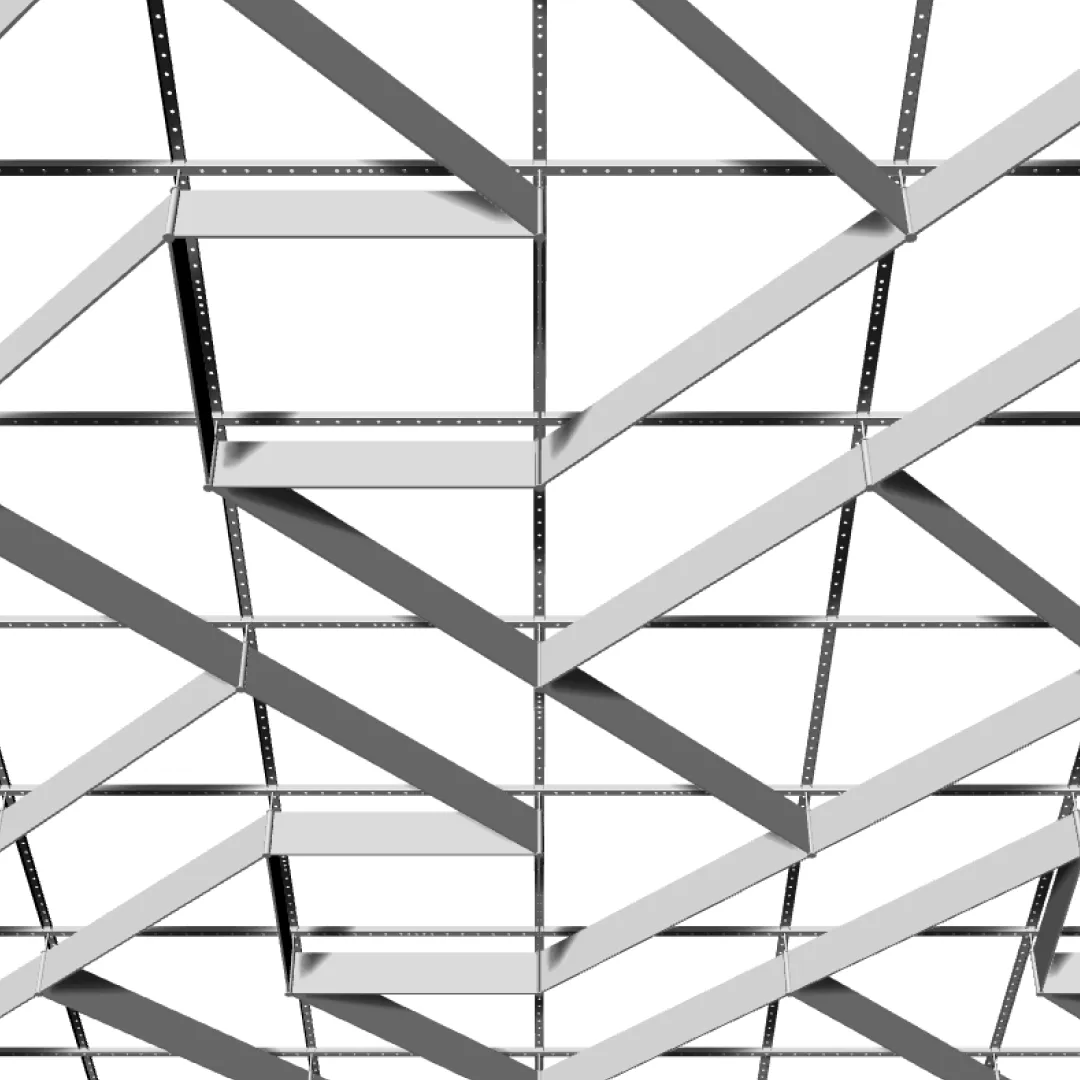 Конструкция формирует повторяющийся рисунок с регулярным диагональным направлением модулей, благодаря чему потолочная поверхность сохраняет структурную цельность и читаемость на больших площадях.