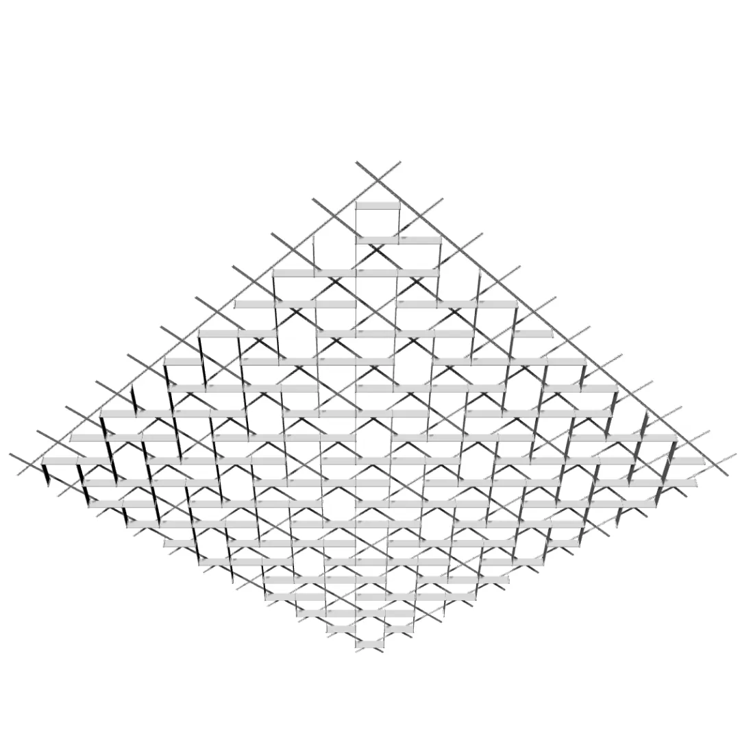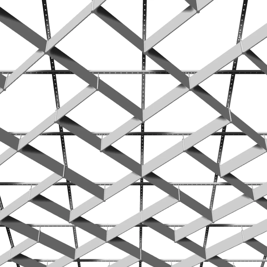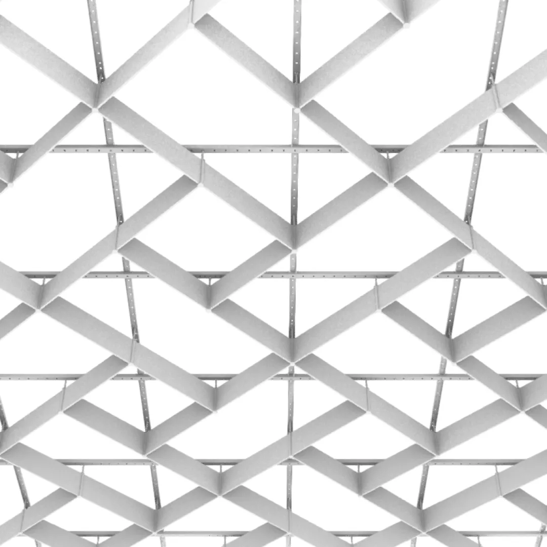 Подвесной потолок-трансформер Дизайн №19 в стандартном исполнении от Оптимус Сити применяется в проектах, где требуется металлическая потолочная система с плотным ромбическим рисунком и регулярным диагональным повторением элементов. Конструкция формирует собранную потолочную поверхность и подходит для общественных и коммерческих помещений.
