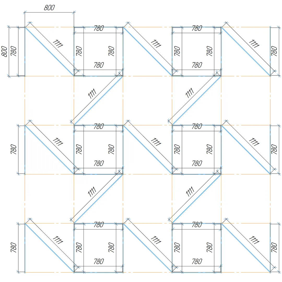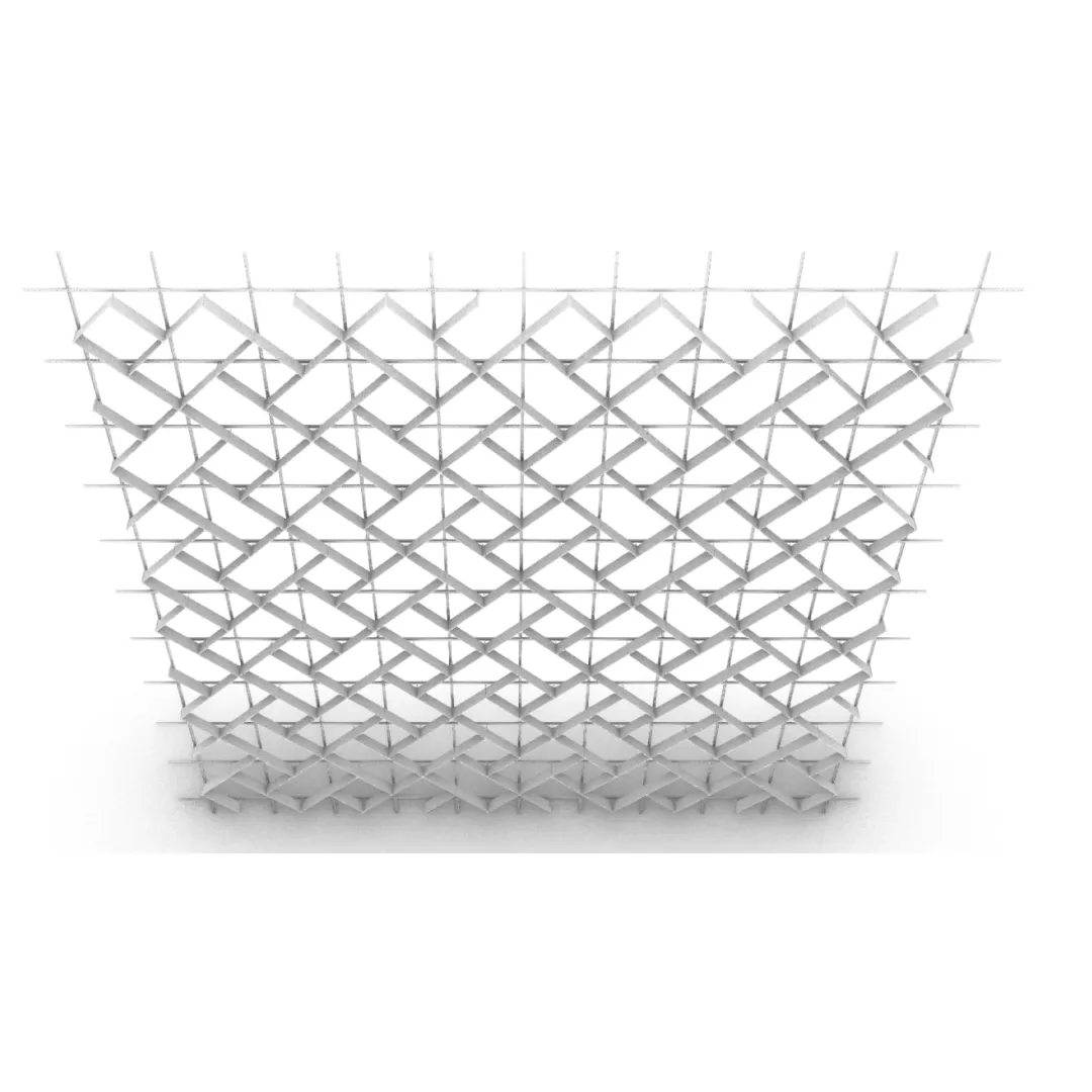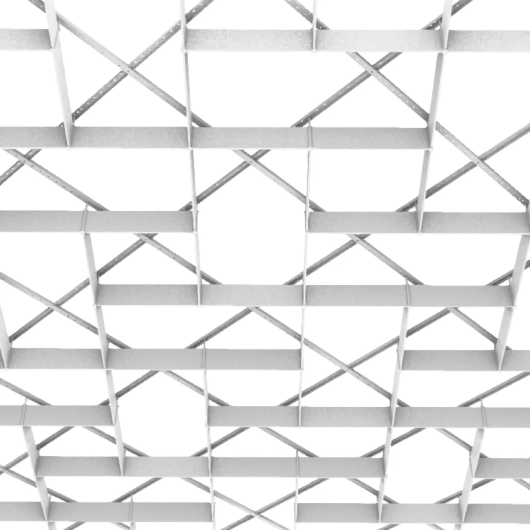 Подвесной потолок-трансформер Дизайн №19 в стандартном исполнении от Оптимус Сити применяется в проектах, где требуется металлическая потолочная система с плотным ромбическим рисунком и регулярным диагональным повторением элементов. Конструкция формирует собранную потолочную поверхность и подходит для общественных и коммерческих помещений.