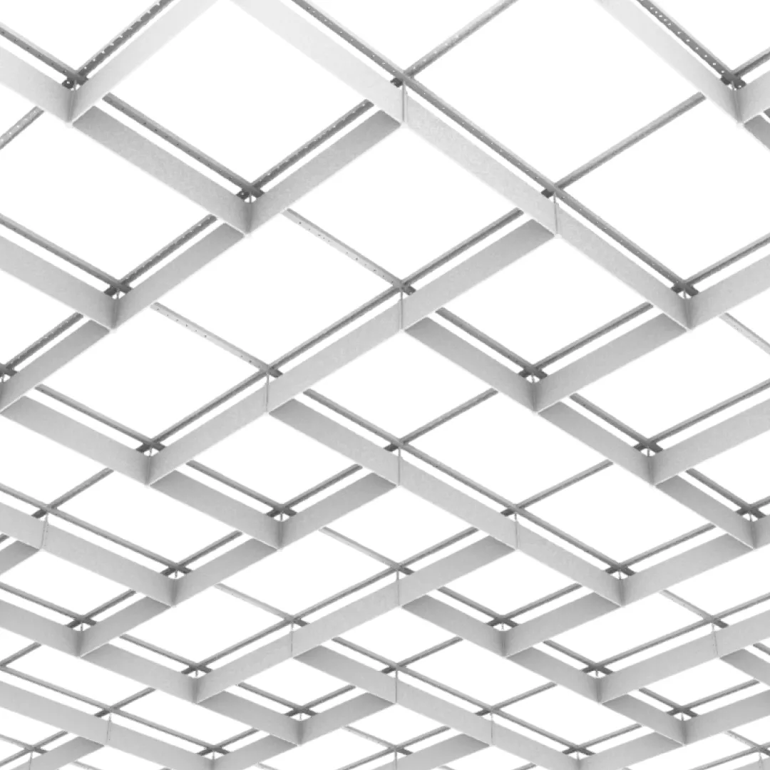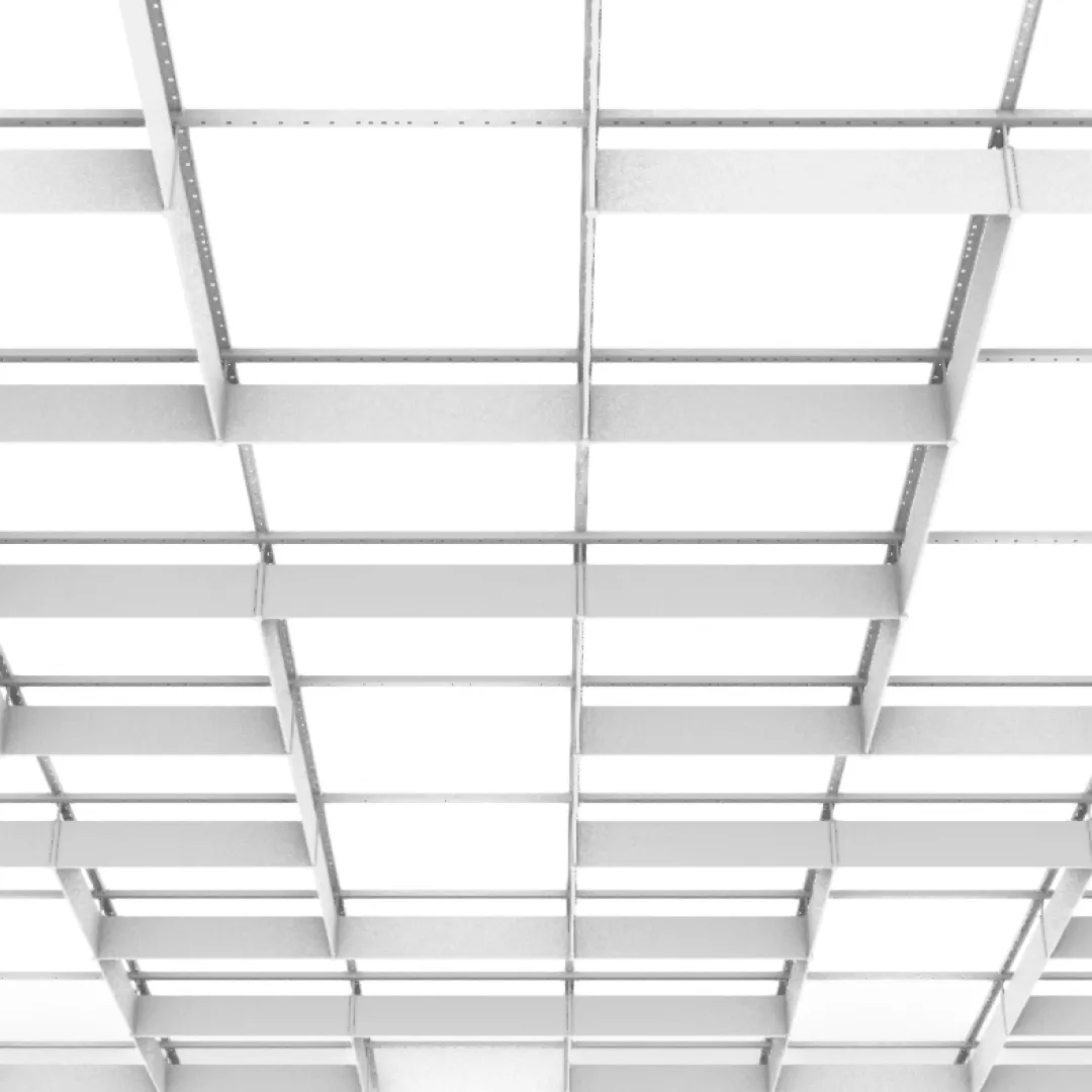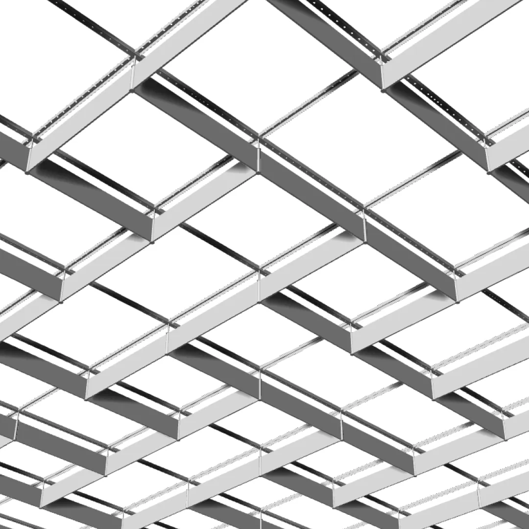 Конструкция формирует регулярный рисунок с прямолинейным повторением модулей, благодаря чему потолочная поверхность сохраняет визуальную упорядоченность и равномерный ритм на больших площадях.