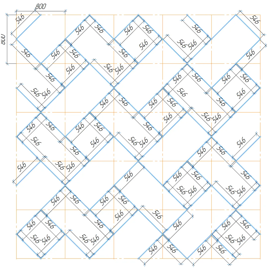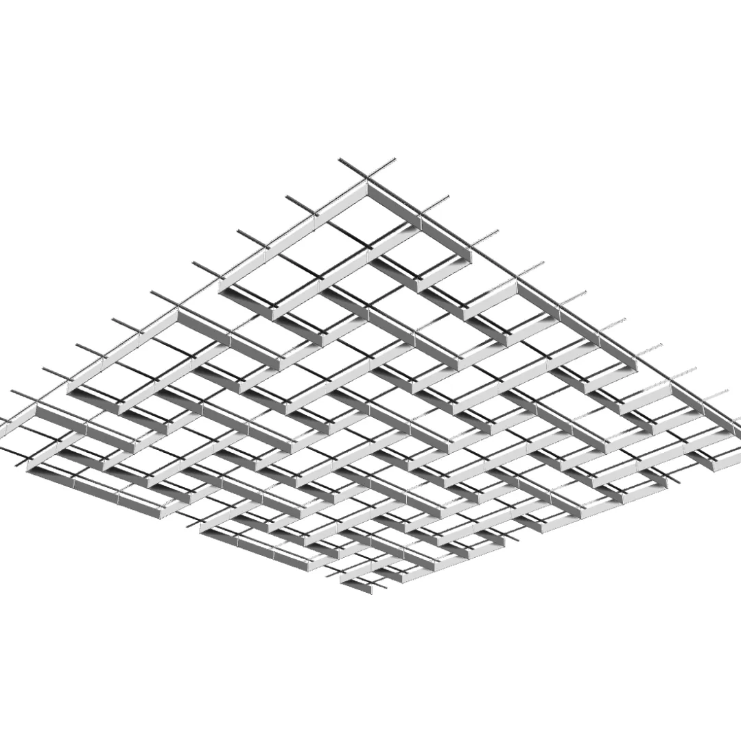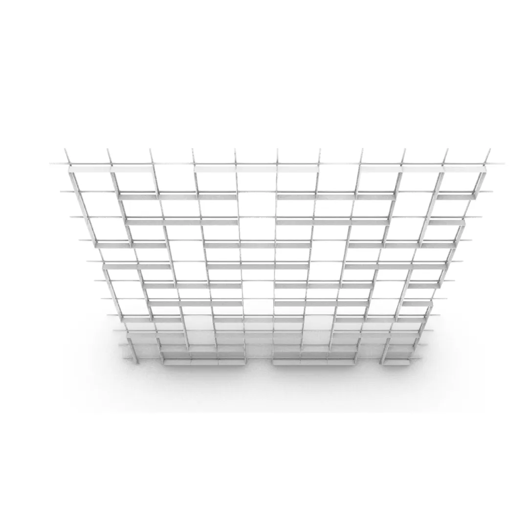 Конструкция формирует регулярный рисунок с прямолинейным повторением модулей, благодаря чему потолочная поверхность сохраняет визуальную упорядоченность и равномерный ритм на больших площадях.
