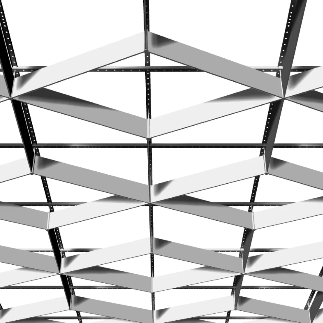 Подвесной потолок-трансформер Дизайн №23 в стандартном исполнении от Оптимус Сити применяется в проектах, где требуется выразительная диагональная геометрия потолка и чёткий модульный ритм. Конструкция формирует ромбовидный рисунок поверхности и хорошо воспринимается на больших площадях.