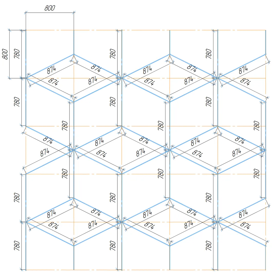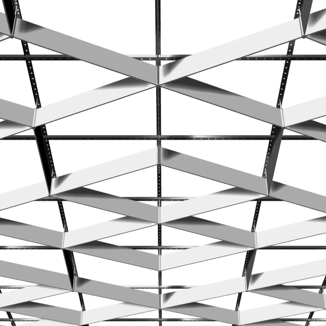 Конструкция формирует спокойный ромбовидный рисунок потолочной поверхности, при котором элементы создают равномерный диагональный ритм без выраженного доминирования отдельных направлений.