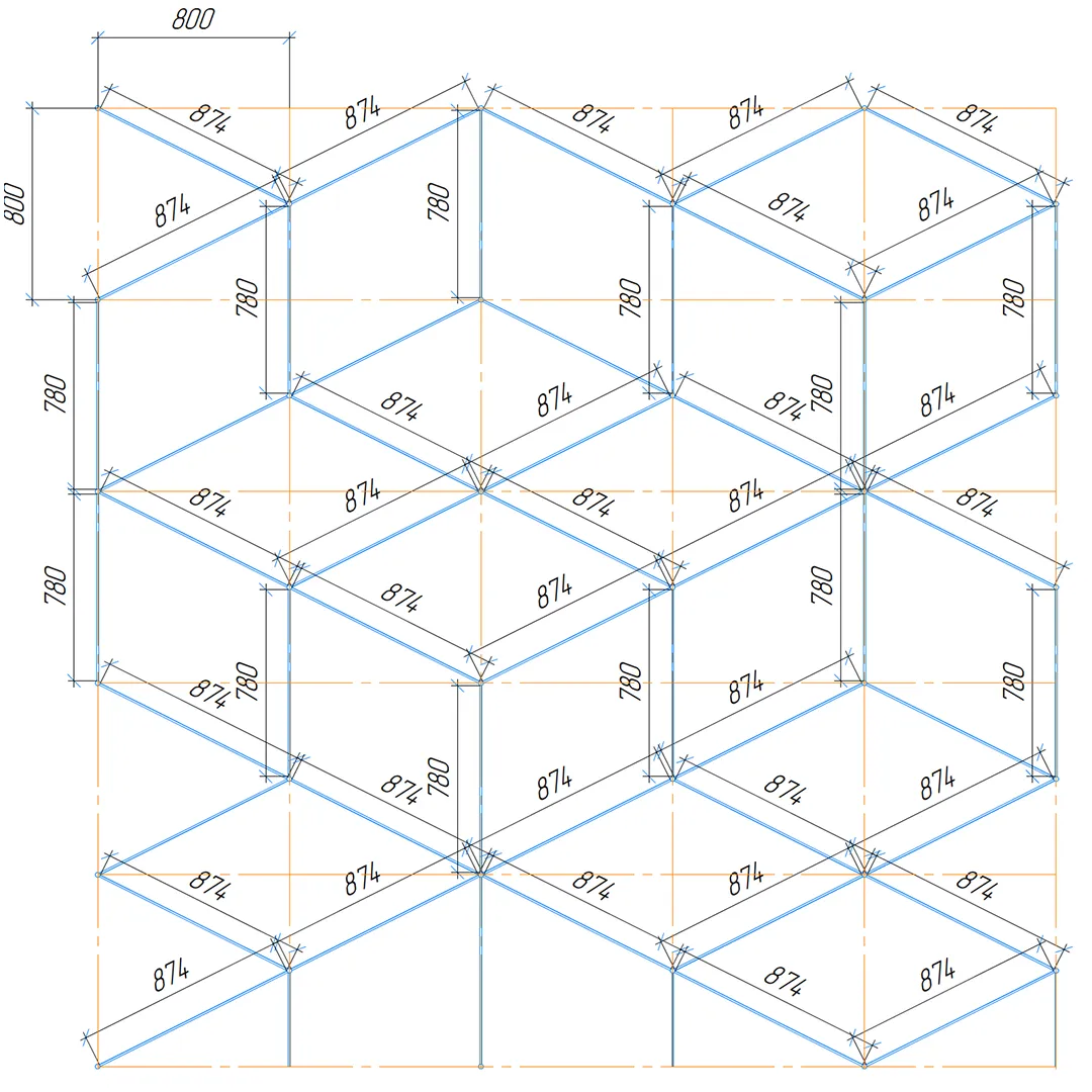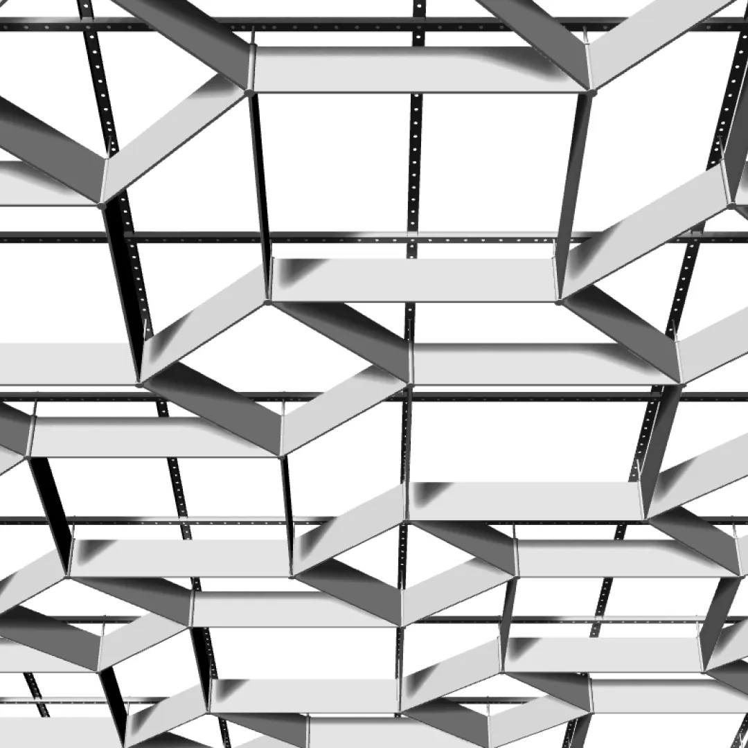 Конструкция формирует плотный ячеистый рисунок потолочной поверхности, в котором укрупнённые ромбовидные элементы создают собранный геометрический ритм и устойчивое визуальное восприятие пространства.
