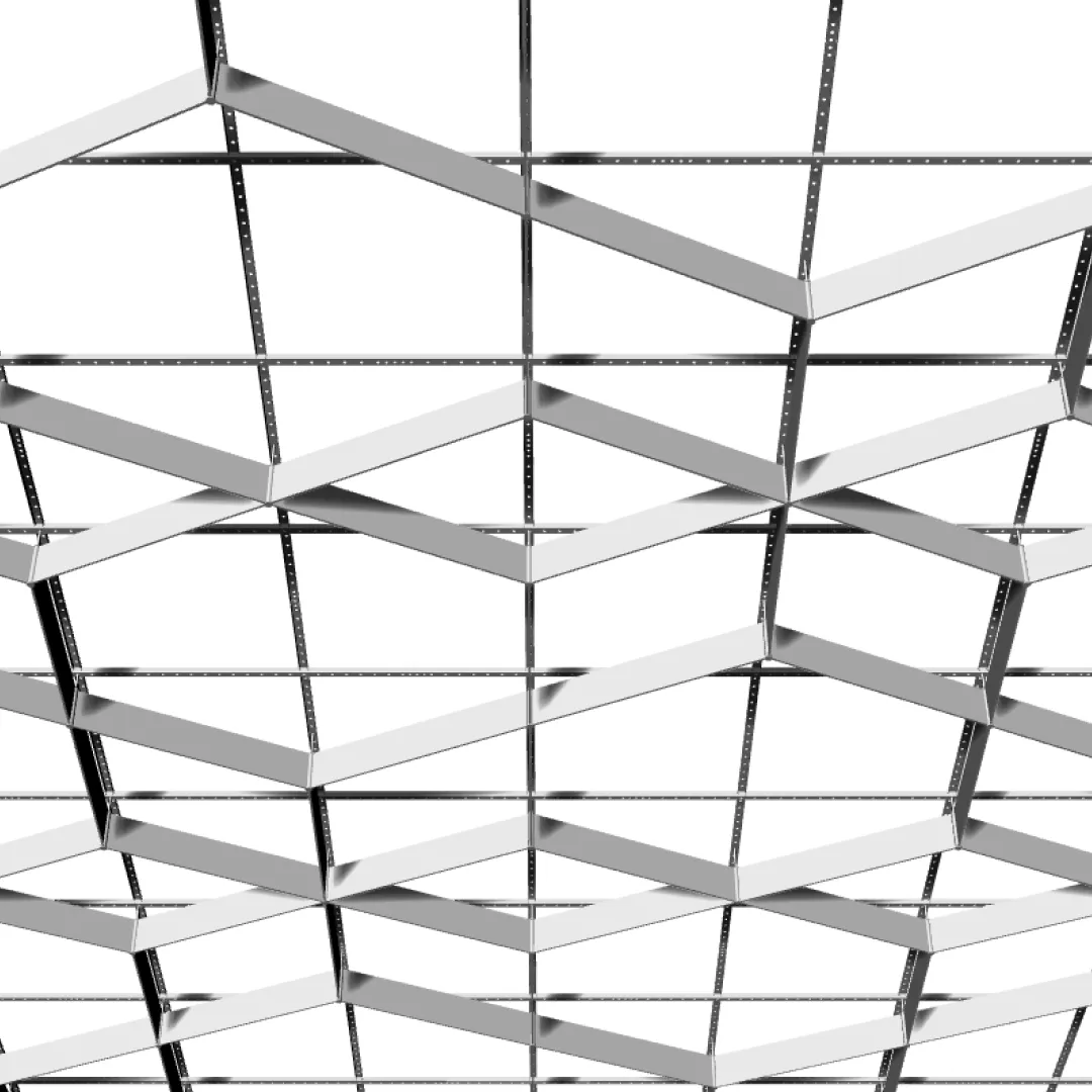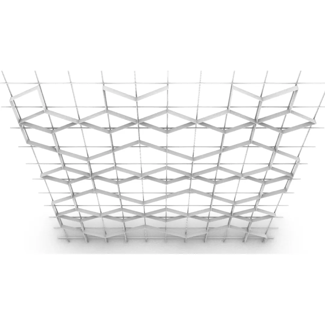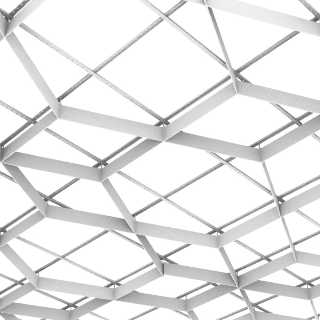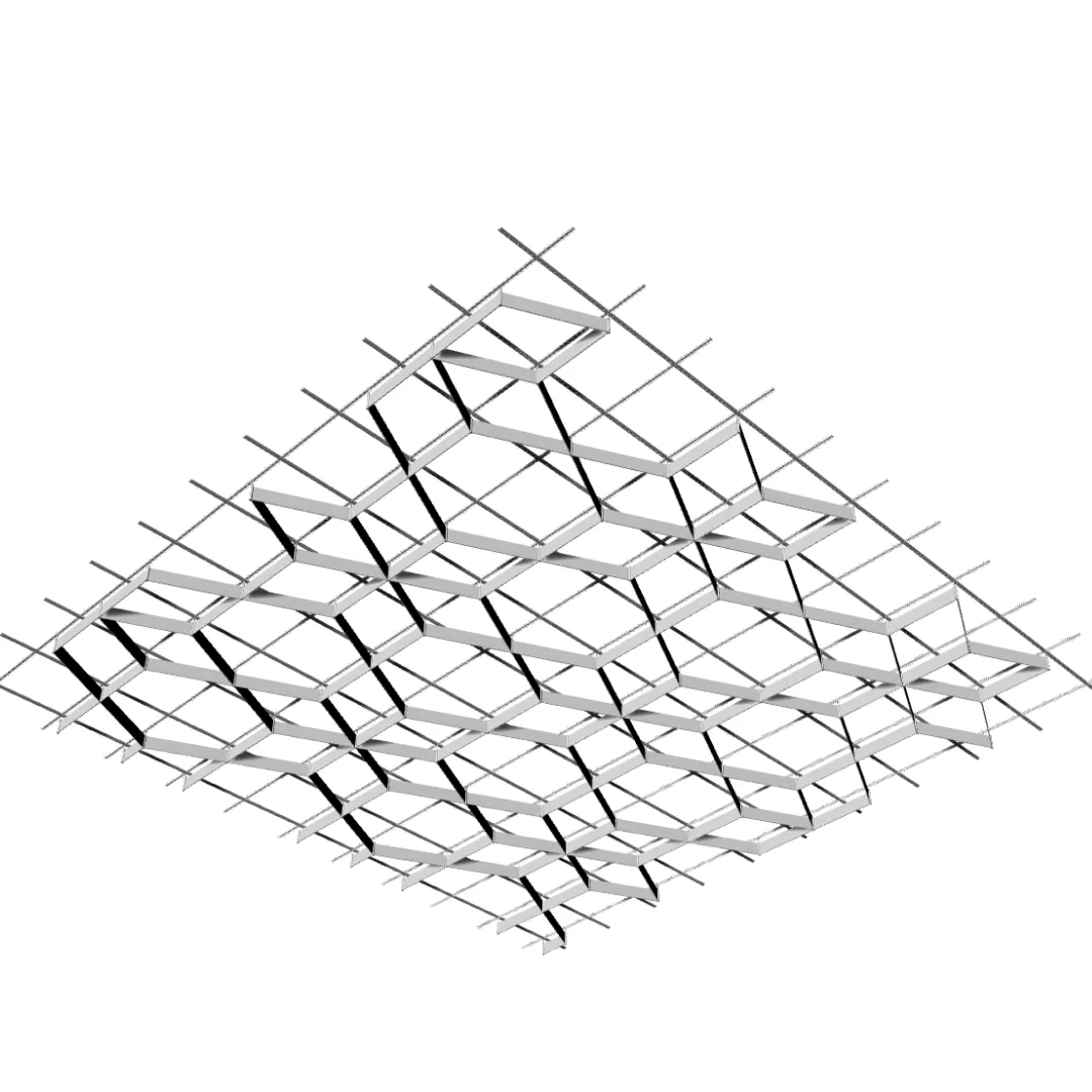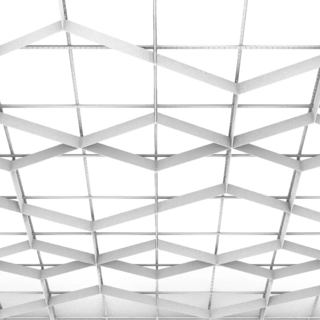 Конструкция формирует направленный потолочный рисунок, в котором отдельные элементы создают динамичный диагональный ритм и подчёркивают архитектурную глубину пространства.