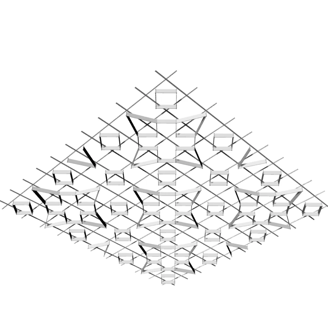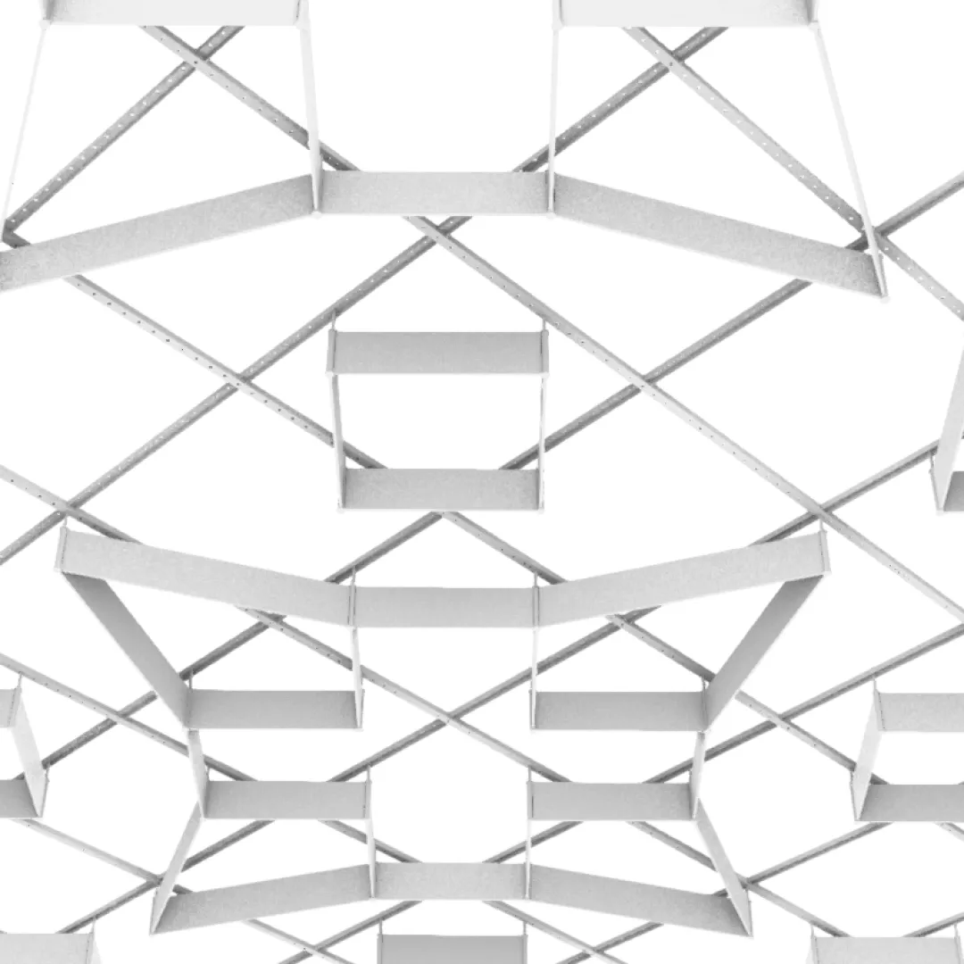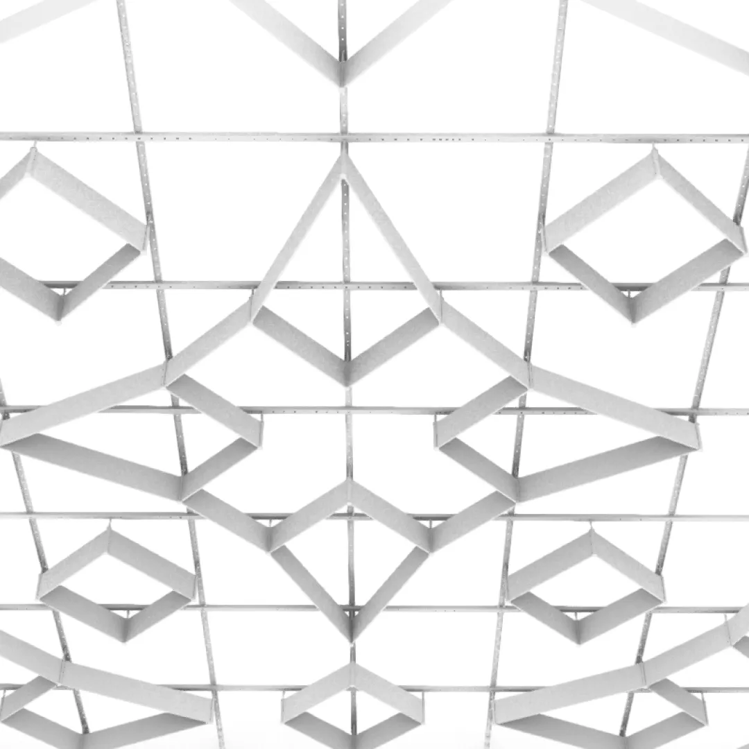 Конструкция формирует редкий потолочный рисунок, в котором отдельные элементы создают акцентную геометрию и подчёркивают архитектурную выразительность пространства.