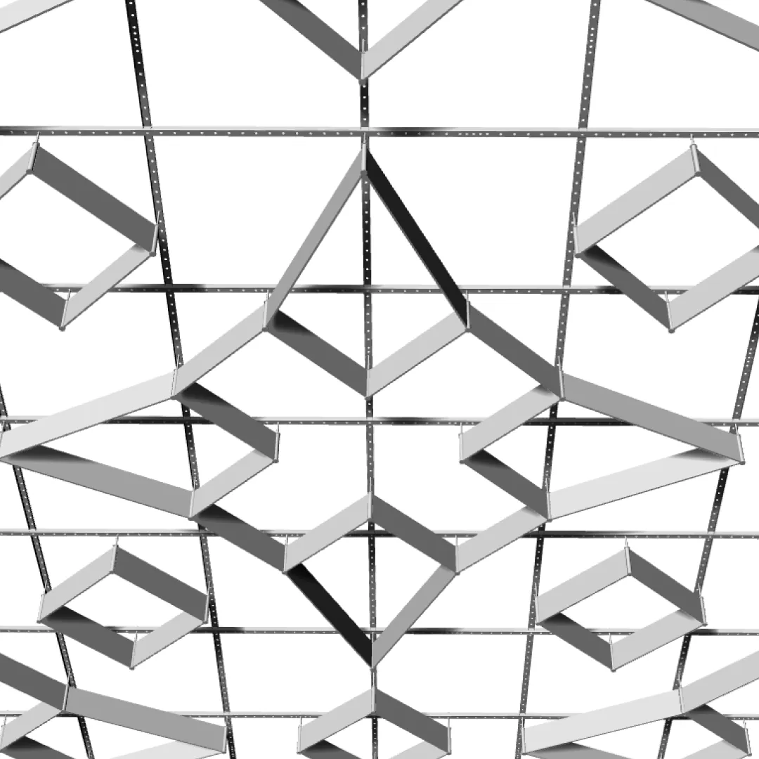 Подвесной потолок-трансформер Дизайн №30 в стандартном исполнении от Оптимус Сити применяется в проектах, где требуется выразительная потолочная геометрия, открытая композиция и визуально акцентный модульный рисунок.