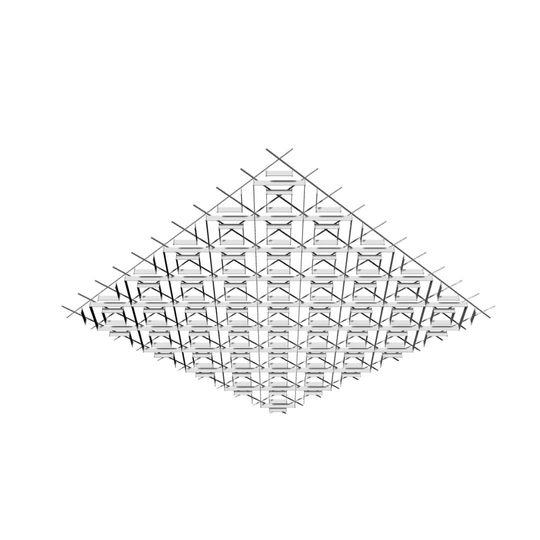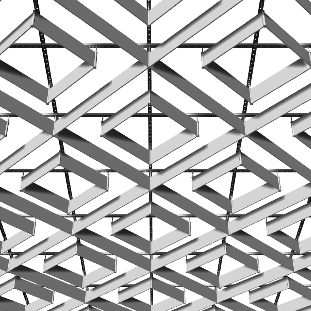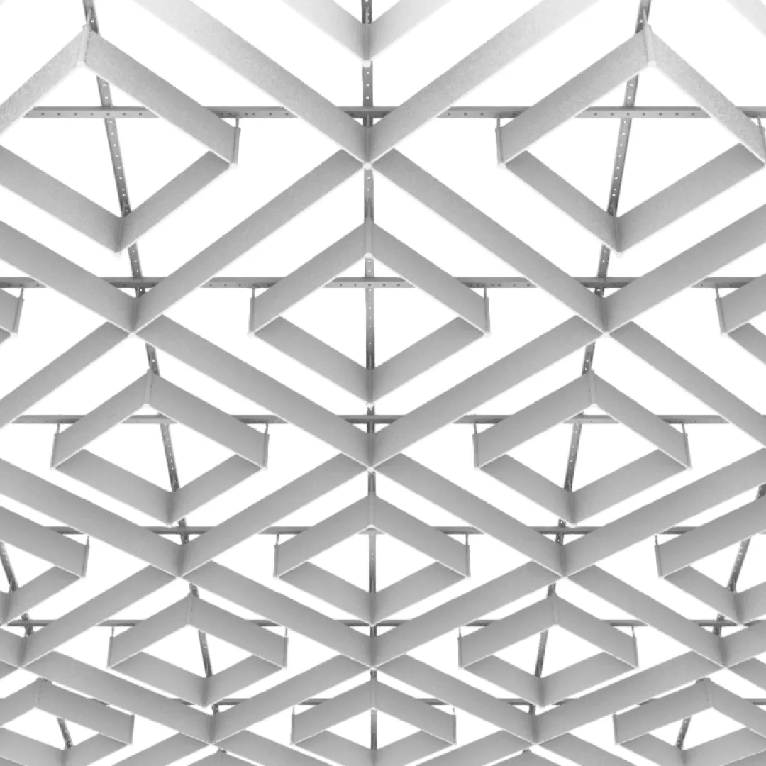 Конструкция формирует плотный повторяющийся рисунок с выраженной ромбовидной геометрией, благодаря чему потолочная поверхность сохраняет единый ритм на больших площадях.
