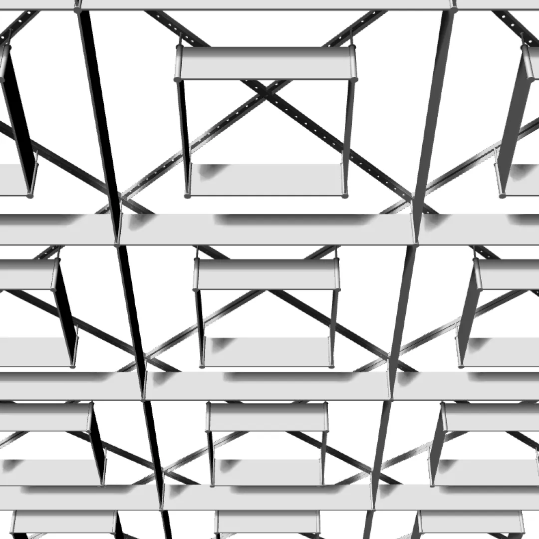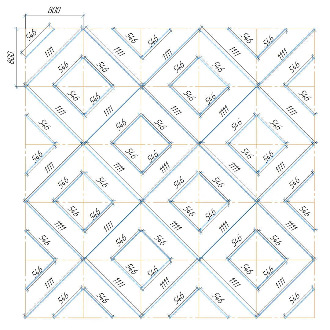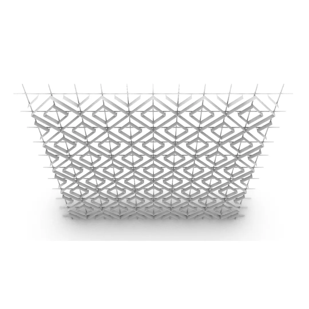 Конструкция формирует плотный повторяющийся рисунок с выраженной ромбовидной геометрией, благодаря чему потолочная поверхность сохраняет единый ритм на больших площадях.