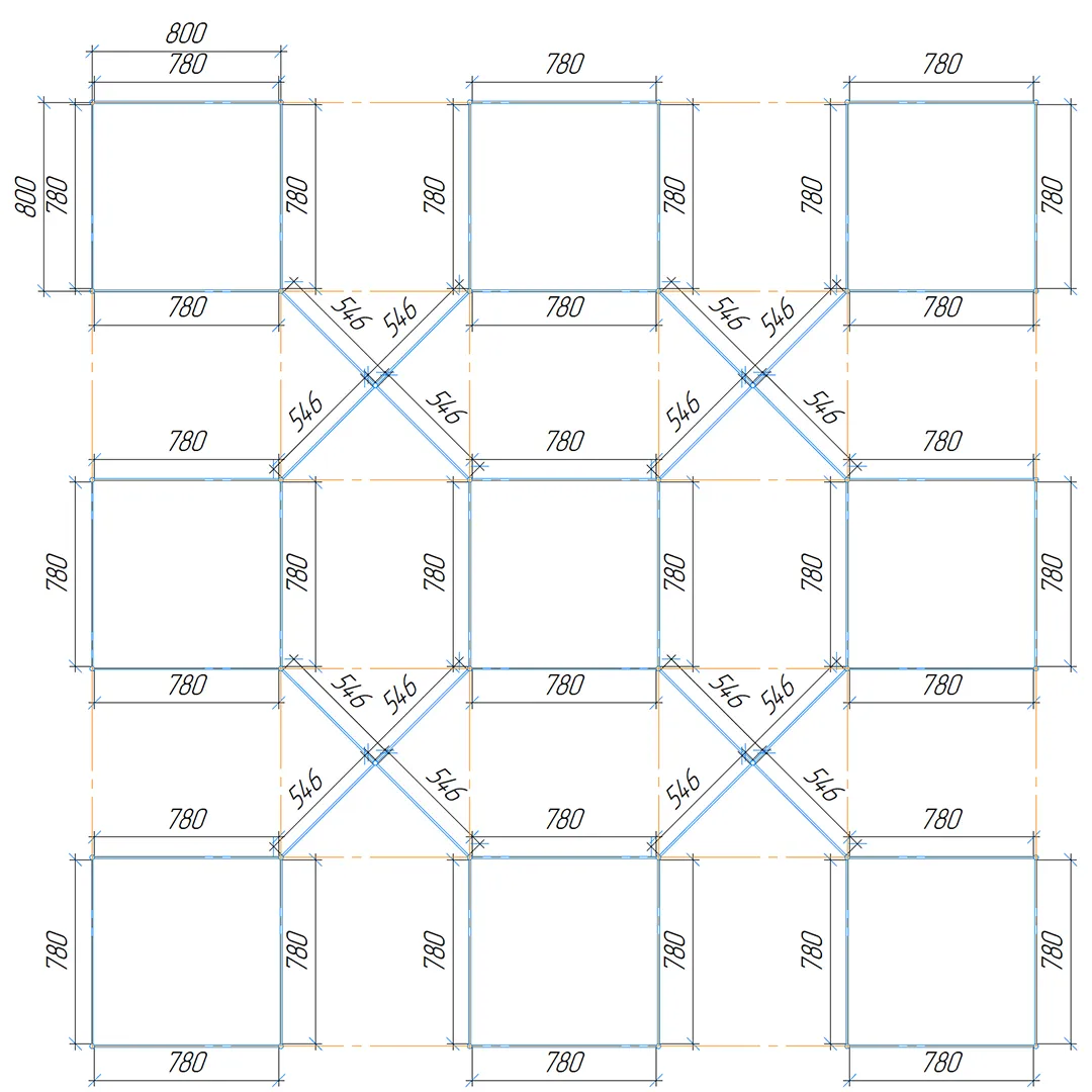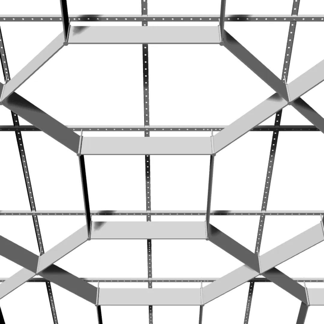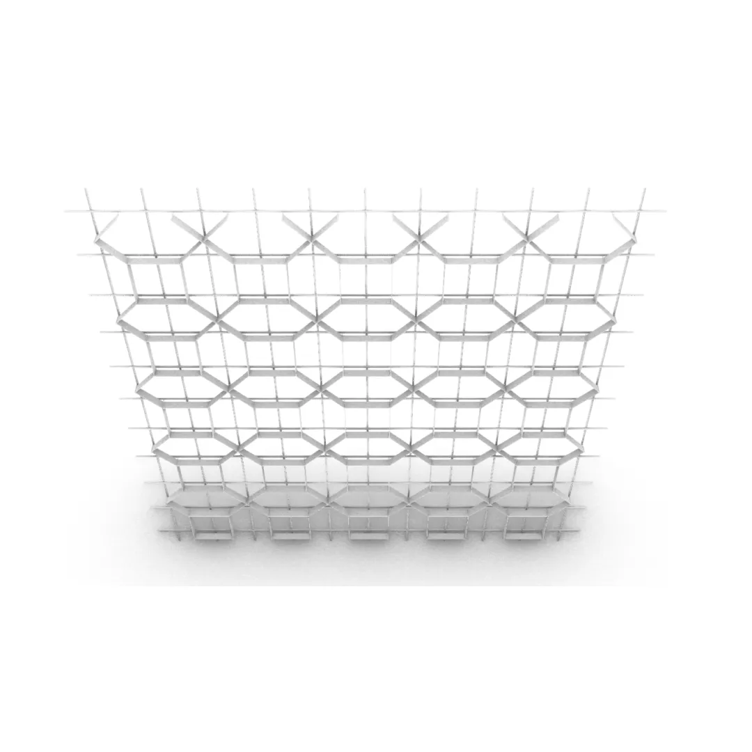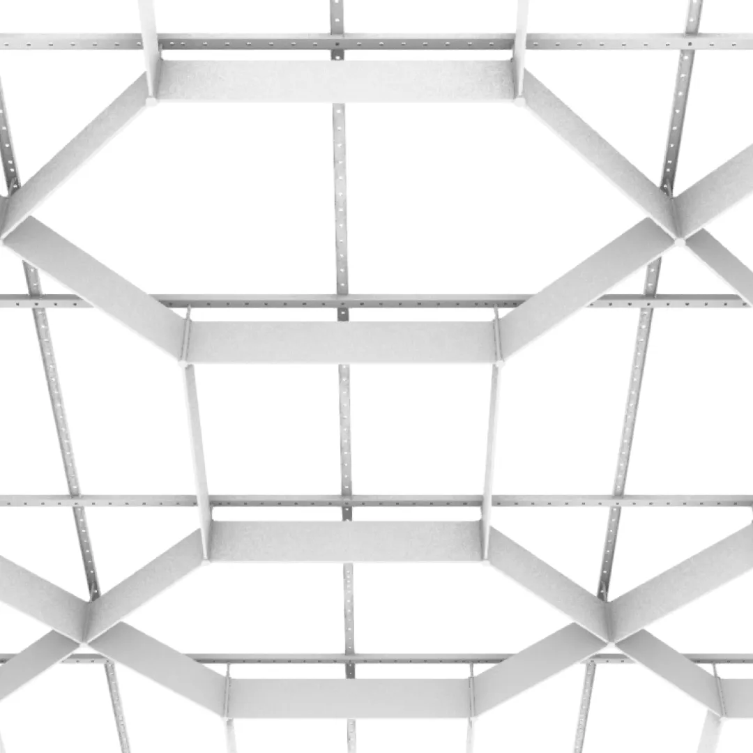 Конструкция формирует повторяющийся рисунок на основе ромбовидных модулей, создавая упорядоченный диагональный ритм потолочного пространства и визуально цельную поверхность.
