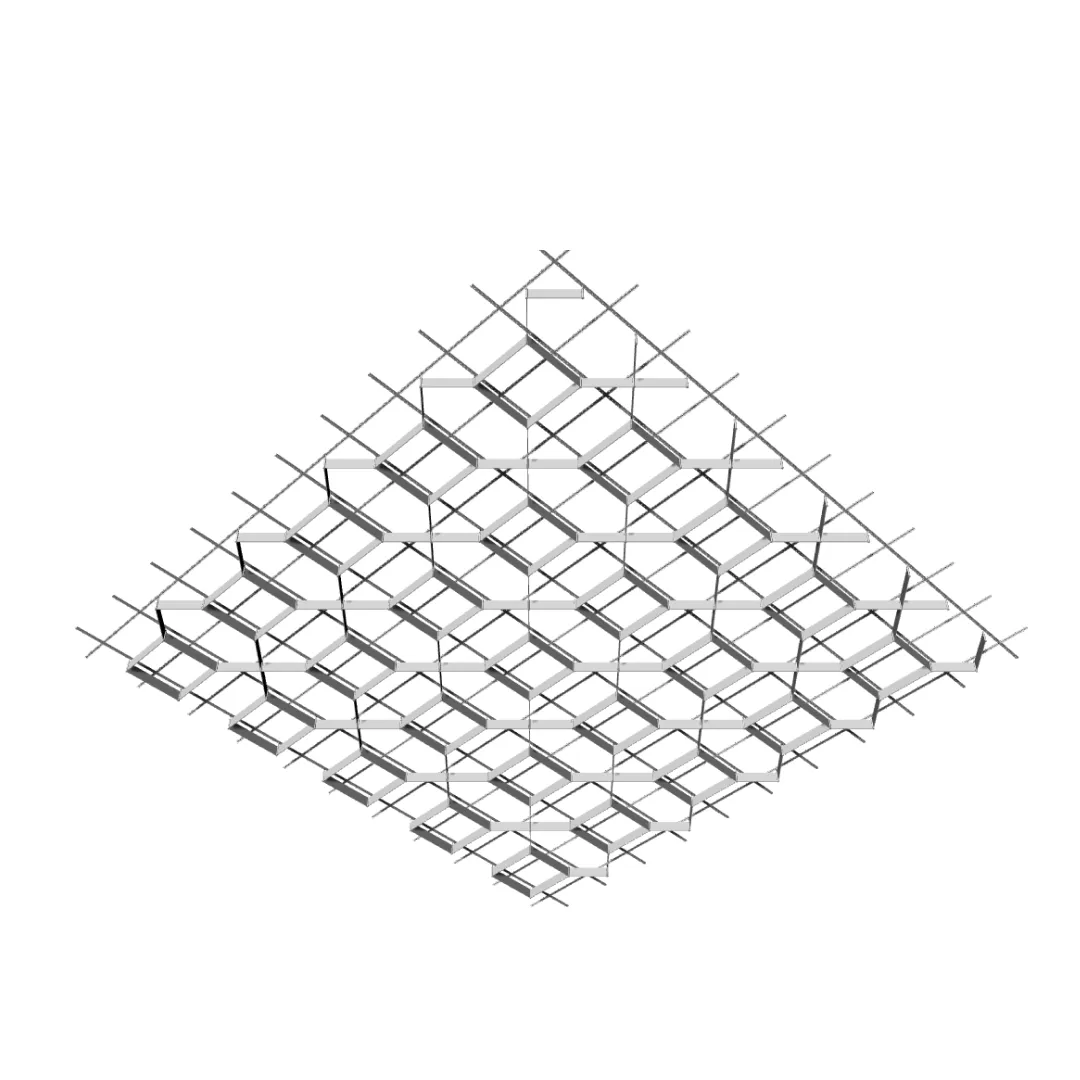 Подвесной потолок-трансформер Дизайн №9 в стандартном исполнении от Оптимус Сити применяется в проектах, где требуется металлическая потолочная система с ромбовидной геометрией и равномерным диагональным ритмом. Конструкция сохраняет стабильную модульность и подходит для серийных решений с окраской по каталогу RAL.