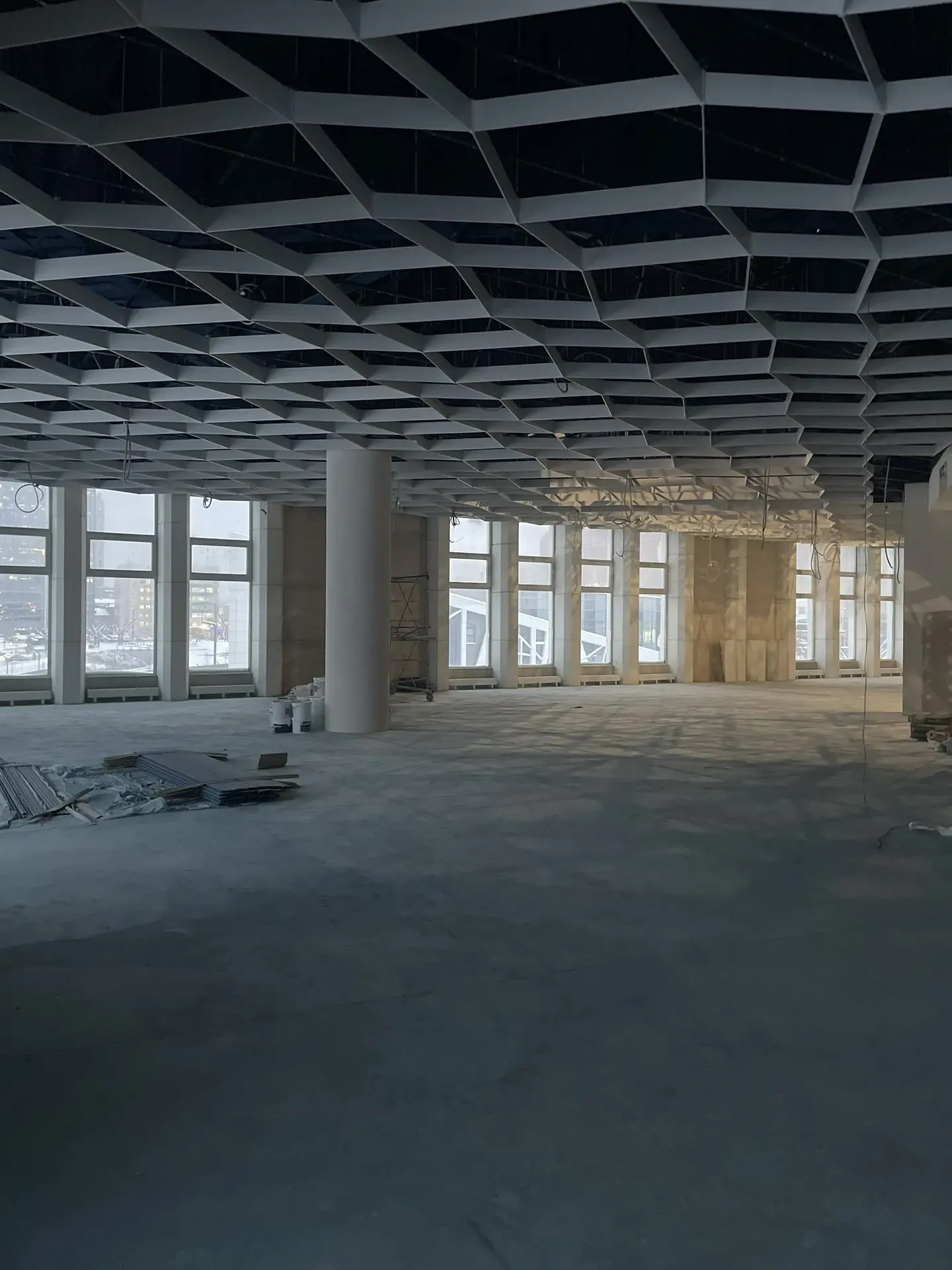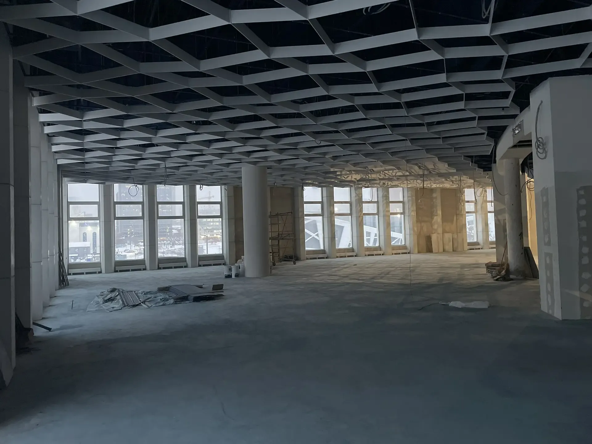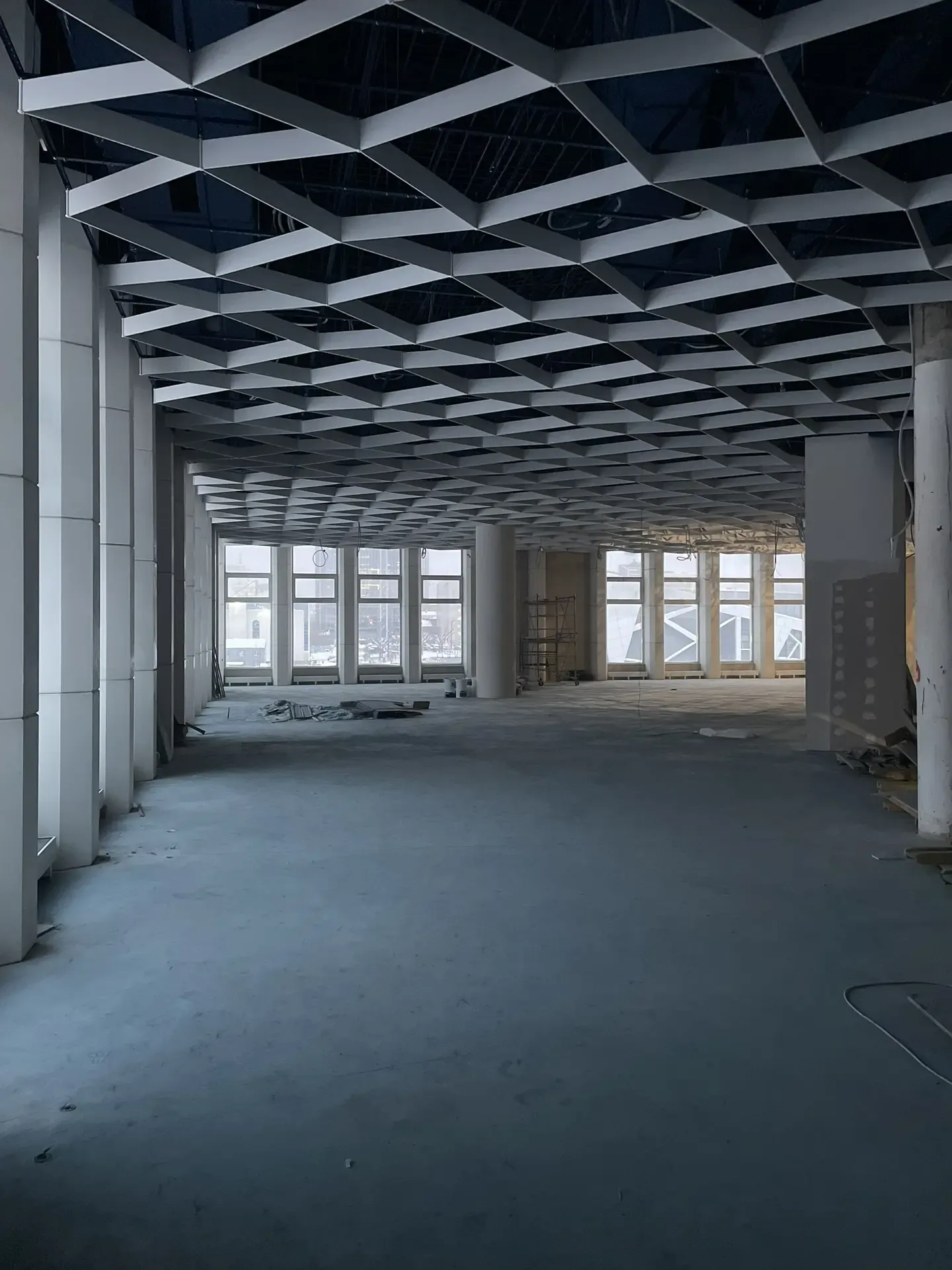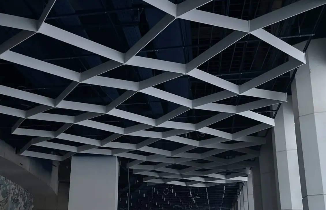 В проекте использована подвесная металлическая система с регулярной модульной геометрией, формирующей выразительный ритм потолочного пространства. Конструкция визуально организует длинный объём помещения и создаёт аккуратную архитектурную структуру без перегрузки интерьера.