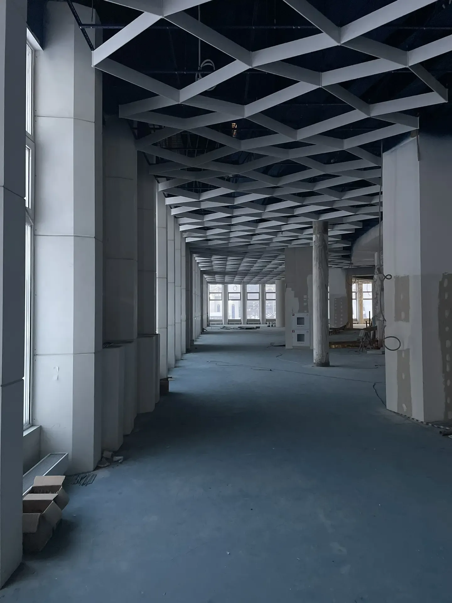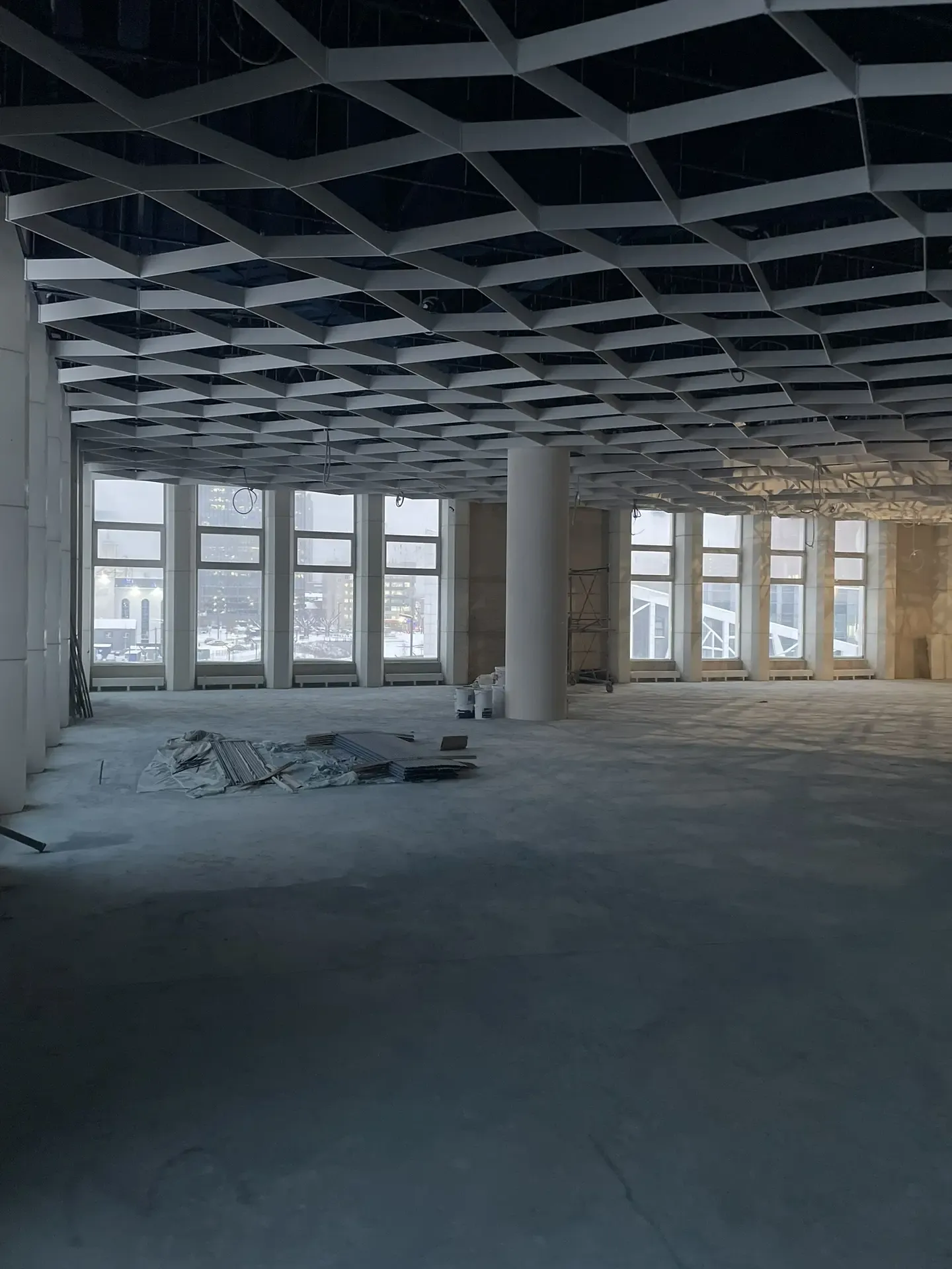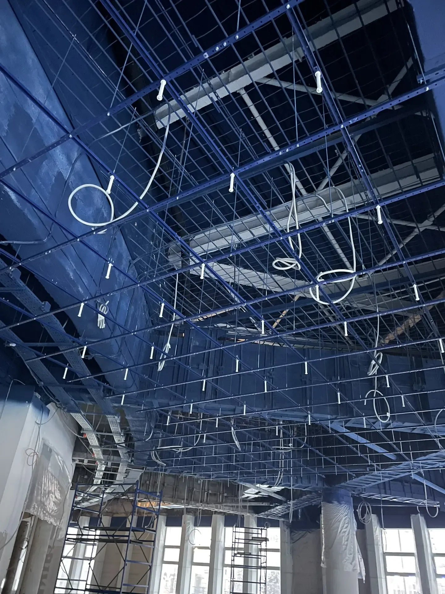 В проекте использована подвесная металлическая система с регулярной модульной геометрией, формирующей выразительный ритм потолочного пространства. Конструкция визуально организует длинный объём помещения и создаёт аккуратную архитектурную структуру без перегрузки интерьера.